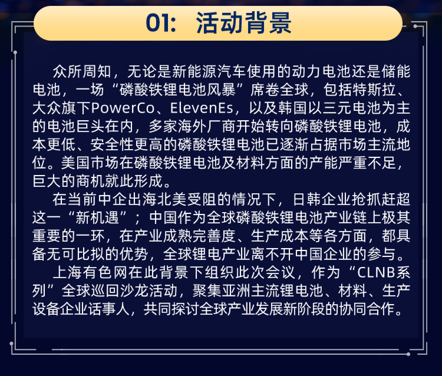 上海有色网在此背景下组织此次会议, 作为“CLNB系列”全球巡回沙龙活动, 聚集亚洲主流锂电池、材料、生产设备企业话事人, 共同探讨全球产业发展新阶段的协同合作。